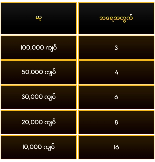 📌 ဆုမဲပိတ္ခ်ိန္သည္ ျမန္မာစံေတာ္ခ်ိန္ ည 10:30 ျဖစ္သည္။ဆုစာရင္းကို မနက္ 11 နာရီတိုင္း Update ေပးပါမည္။